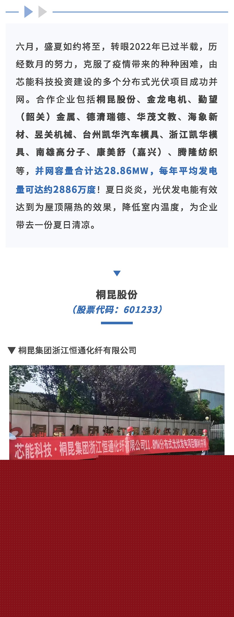 28.86MW!桐昆股份、金龍電機、海象新材等多個分布式光伏項目成功并網 2022-06-20 00:00:00 浙江芯能光伏科技股份有限公司 Viewd 5831 Previous賽峰集團3.82MW分布式光伏項目順利開工 Next芯能科技黨支部開展“追溯紅色記憶,汲取奮進力量”主題黨日活動